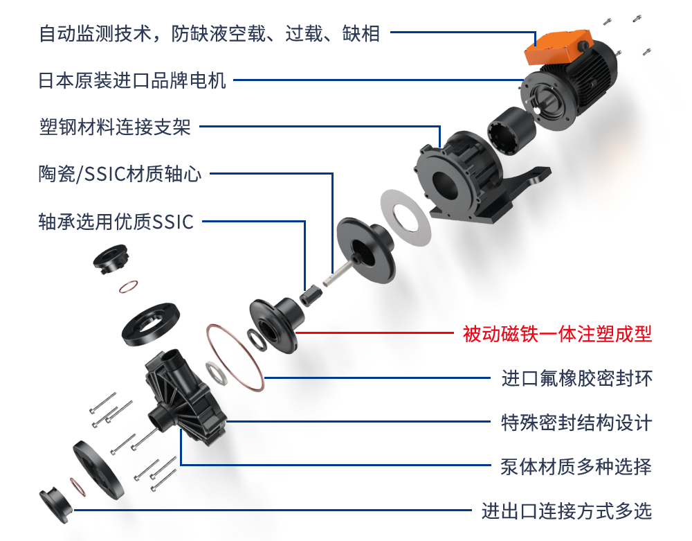 日本進(jìn)口PPH、PVDF、CFRETFE泵體材質(zhì),耐受PH1~14酸堿藥水,零泄漏;掌握磁力泵多項核心技術(shù),制造工藝嚴(yán)謹(jǐn),效率可達(dá)70%+,高效率、低能耗,可量身定制;13年高品質(zhì)磁力泵精細(xì)工藝制作,產(chǎn)能達(dá)15萬套/年,可平行替代進(jìn)口磁力泵。